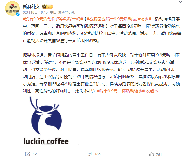 雖然已經(jīng)站在國內(nèi)咖啡連鎖行業(yè)的頂端,但對(duì)瑞幸來說,接下來的路并非全是坦途。去年第四季度,瑞幸的營業(yè)利潤率為3.0%,而去年前三季度,這個(gè)數(shù)字分別為15.3%、18.9%、13.4%,下滑可以說是非常明顯,瑞幸認(rèn)為導(dǎo)致這一情況的主要原因是產(chǎn)品平均銷售價(jià)格的下降。另一邊,前不久有消費(fèi)者發(fā)現(xiàn),瑞幸的9.9元咖啡活動(dòng)明顯縮水,原本很多產(chǎn)品都能享受9.9元的活動(dòng)價(jià),如今在小程序上,只剩下10款產(chǎn)品能參與活動(dòng)。對(duì)此瑞幸官網(wǎng)客服告訴“南都灣財(cái)社”,從1月22日開始,部分門店的飲品不再參與此活動(dòng),后續(xù)是否會(huì)調(diào)整,目前還不清楚。有觀點(diǎn)認(rèn)為,營業(yè)利潤率下降可能是導(dǎo)致瑞幸9.9元活動(dòng)縮水的主要原因。