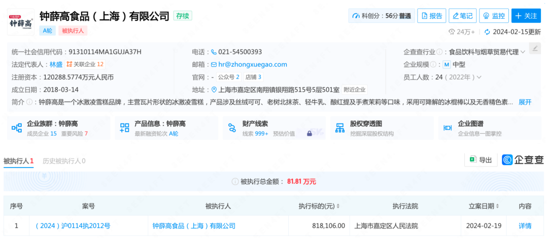 此外,鐘薛高食品(上海)有限公司近日新增一則被執(zhí)行人信息,執(zhí)行標(biāo)的81.81萬(wàn)元,執(zhí)行法院為上海市嘉定區(qū)人民法院。據(jù)了解,該公司所持多家公司股權(quán)已被凍結(jié)。
