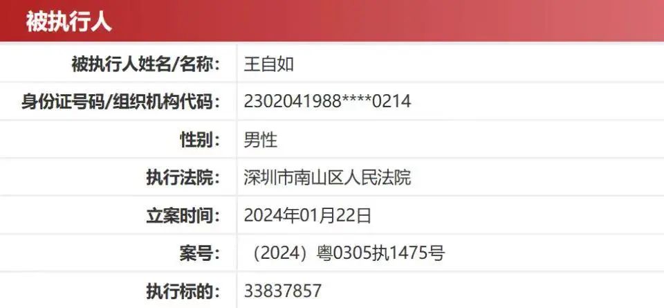 近期,中國執(zhí)行信息公開網(wǎng)顯示,王自如新增一則被執(zhí)行人信息,執(zhí)行標(biāo)的3383萬余元,執(zhí)行法院為深圳市南山區(qū)人民法院。