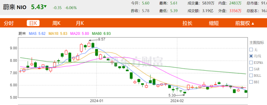 伴隨上述諸多“降級(jí)”信號(hào)的是,蔚來汽車的股價(jià)在2024年開始至2月29日,已經(jīng)從約72港元/股下降至43.8港元/股,開年2個(gè)月累計(jì)降幅已達(dá)39.79%,最新港股市值約687.9億港元,約為理想汽車總市值的22%。