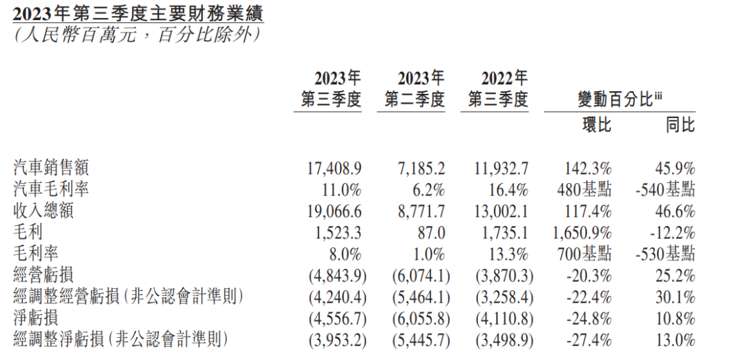 蔚來2023年3季度業(yè)績(jī)報(bào)告顯示,公司第三季度營(yíng)收190.7億元,環(huán)比增長(zhǎng)117.4%,同比增長(zhǎng)46.6%,現(xiàn)金儲(chǔ)備452億元,環(huán)比增加137億元,凈虧損約45.57億元,環(huán)比下降24.8%