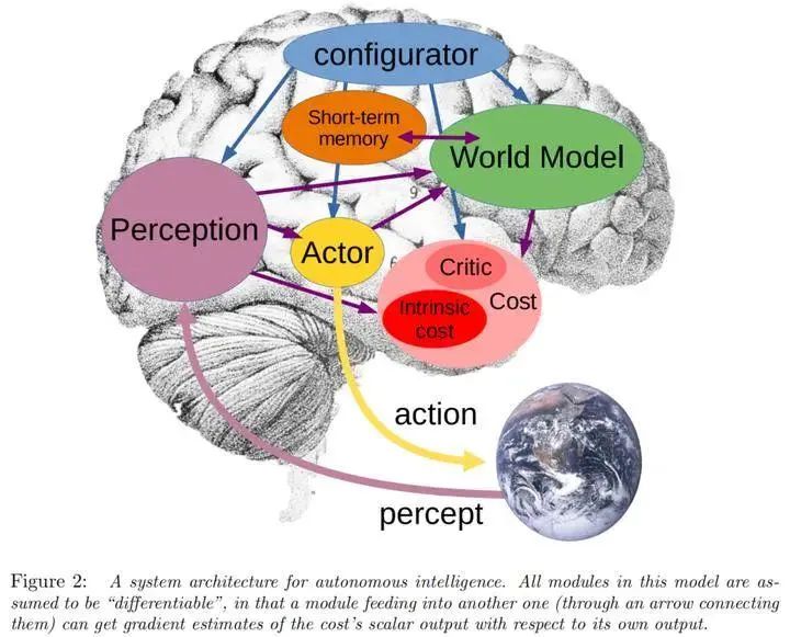2023年,楊立昆提出一個(gè)新構(gòu)思,即根據(jù)大腦運(yùn)行機(jī)制,建立一個(gè)端到端的仿生架構(gòu),包含6個(gè)核心模塊:配置器、感知模塊、世界模型、成本模塊、參與者模塊和短期記憶模塊,他基于該理念設(shè)計(jì)出V-JEPA“非生成模型”。