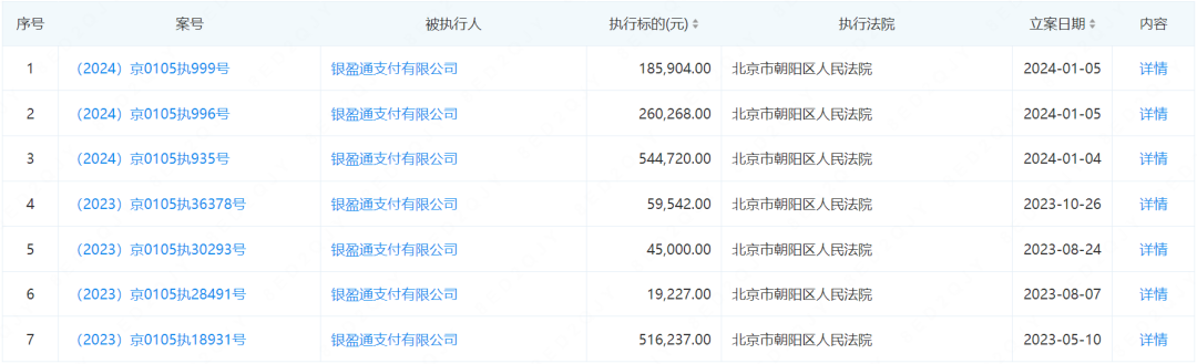 銀盈通的執(zhí)行信息也在增多。從中國(guó)執(zhí)行信息網(wǎng)和企查查獲悉,銀盈通最新一條執(zhí)行信息的立案時(shí)間為2024年1月5日,執(zhí)行標(biāo)的為18.59萬元,執(zhí)行法院系北京市朝陽區(qū)法院。自2023年至今,銀盈通已被法院累計(jì)執(zhí)行7次,共計(jì)執(zhí)行金額163.09萬元。