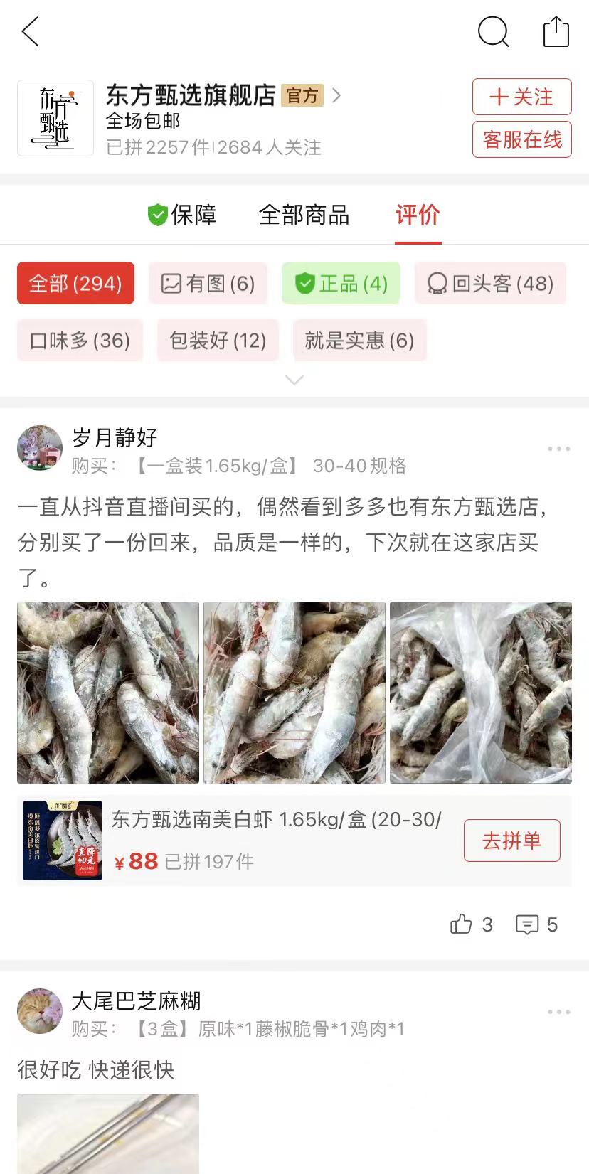 該店最新一份評(píng)論是關(guān)于最近引起熱議的“東方甄選南美白蝦”,該評(píng)論曬出自己分別于抖音直播間喝拼多多店鋪購(gòu)買的南美白蝦,表示”品質(zhì)是一樣的,下次就在這家店買了”。