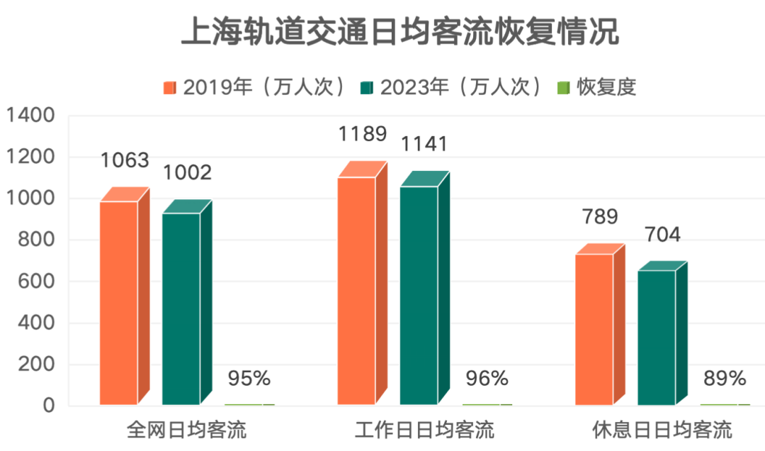 其中,軌道交通工作日日均客流達(dá)到1141萬(wàn)人次,恢復(fù)至2019年的96%(2019年1189萬(wàn));休息日日均客流704萬(wàn)人次,恢復(fù)至2019年的89%(2019年789萬(wàn)),比工作日的96%低7個(gè)百分點(diǎn)。
