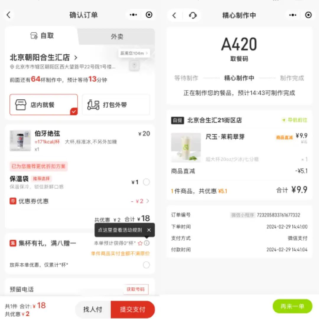 (同一時(shí)間段,霸王茶姬等待時(shí)間13分鐘,茶貓從下單到出品2分鐘左右)