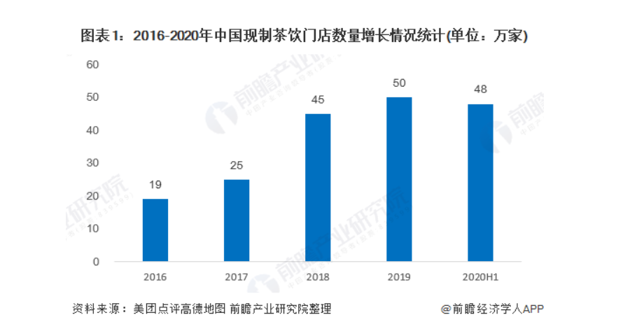 而從前瞻經(jīng)濟(jì)學(xué)人的數(shù)據(jù)上可以看到,2016-2019年間,國(guó)內(nèi)茶飲門(mén)店數(shù)量保持著飛速的增長(zhǎng),從2016年的19萬(wàn)家,一路飆升到50萬(wàn)家,但等時(shí)間來(lái)到2020年,門(mén)店數(shù)量首次出現(xiàn)了下滑。