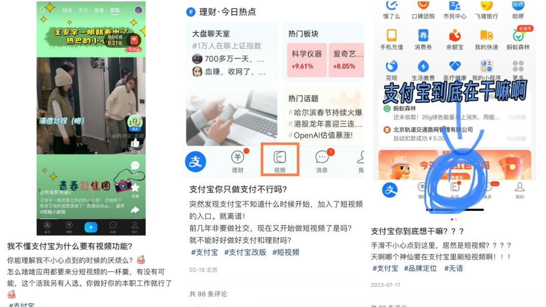 而對(duì)比之下,支付寶的短視頻卻顯得有些不受待見(jiàn)。盡管沒(méi)有具體的公開(kāi)數(shù)據(jù),但從社交媒體上的用戶(hù)反饋也可窺得一二。其中,在小紅書(shū)上,“突然發(fā)現(xiàn)支付寶不知道什么時(shí)候開(kāi)始,加入了短視頻的入口,就離譜!前幾年非要做社交,現(xiàn)在又要開(kāi)始做短視頻是嗎?”“我不懂支付寶為什么要有視頻功能?你能理解我不小心點(diǎn)到的時(shí)候的厭煩么,怎么啥應(yīng)用都要來(lái)分短視頻的一杯羹,有沒(méi)有可能這個(gè)活我令人人選,你做好你的本職工作就行了”“手滑不小心點(diǎn)到這里,居然是短視頻?天啊哪個(gè)神仙要在支付寶里刷短視頻啊!”此類(lèi)的吐槽帖并不少見(jiàn)。
