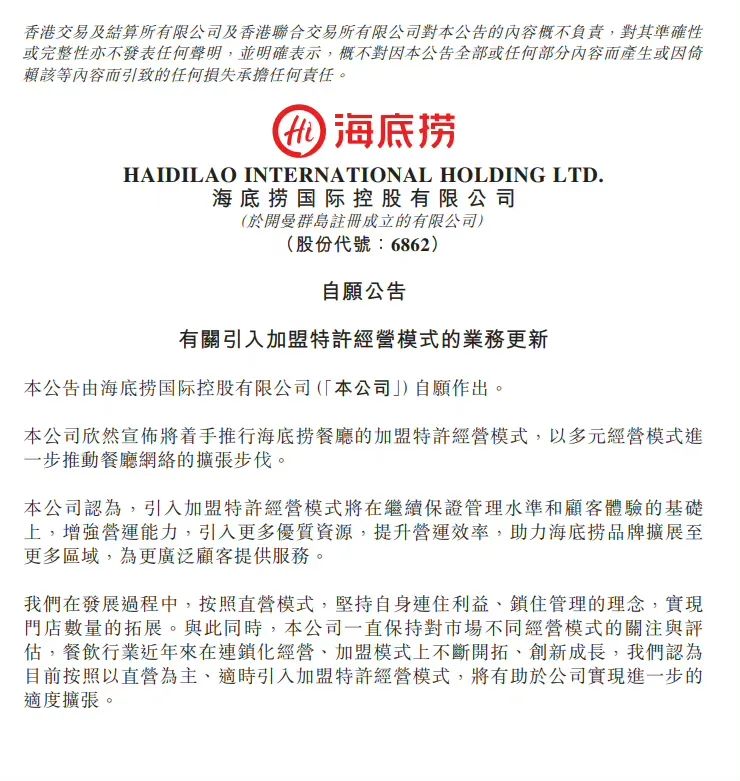海底撈認(rèn)為,引入加盟特許經(jīng)營(yíng)模式將在繼續(xù)保證管理水準(zhǔn)和顧客體驗(yàn)的基礎(chǔ)上,增強(qiáng)營(yíng)運(yùn)能力,引入更多優(yōu)質(zhì)資源,提升營(yíng)運(yùn)效率,助力海底撈品牌擴(kuò)展至更多城市,為更廣泛顧客提供服務(wù)。