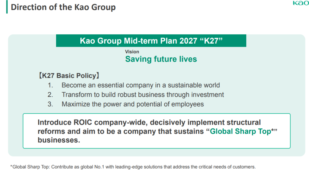 而在最新的財(cái)報(bào)中,花王繼而提出“K27”計(jì)劃,以“全球銳頂戰(zhàn)略”(即Global Sharp Top:通過解決客戶關(guān)鍵需求的領(lǐng)先解決方案,成為全球第一)為基礎(chǔ),推動(dòng)人力資源和業(yè)務(wù)的發(fā)展,以維持全球強(qiáng)大的優(yōu)質(zhì)業(yè)務(wù)。