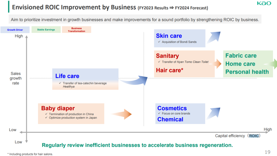 在財(cái)報(bào)中,花王將旗下品牌以增長(zhǎng)率和資本回報(bào)率為指標(biāo),分為四類。其中,頭皮護(hù)理被視為高增長(zhǎng)、高回報(bào)的業(yè)務(wù)。