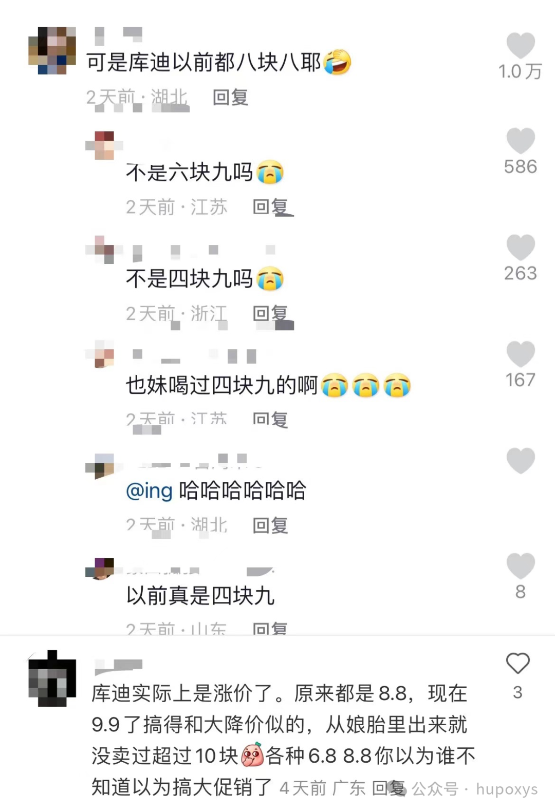 在抖音和小紅書(shū)等社交媒體平臺(tái),就有不少消費(fèi)者針對(duì)庫(kù)迪此次促銷(xiāo)活動(dòng)表示“還我8.8”,更有人直言“庫(kù)迪實(shí)際上是漲價(jià)了”“原來(lái)都是8.8,現(xiàn)在9.9搞得和大降價(jià)似的”......