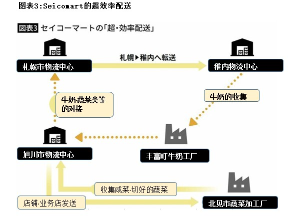 該公司的物流體系中,存在著從一般物流的角度來看很難相信的狀態(tài)。經常能維持八成以上的載重率。在廣闊的北海道,單程送達(回程貨物為空載)才是最大的低效。因此,該公司將自身的物流功能與集團公司的制造功能相結合,消化成本,構建物流系統(tǒng),將其配送到遍布北海道全境的各個店鋪。