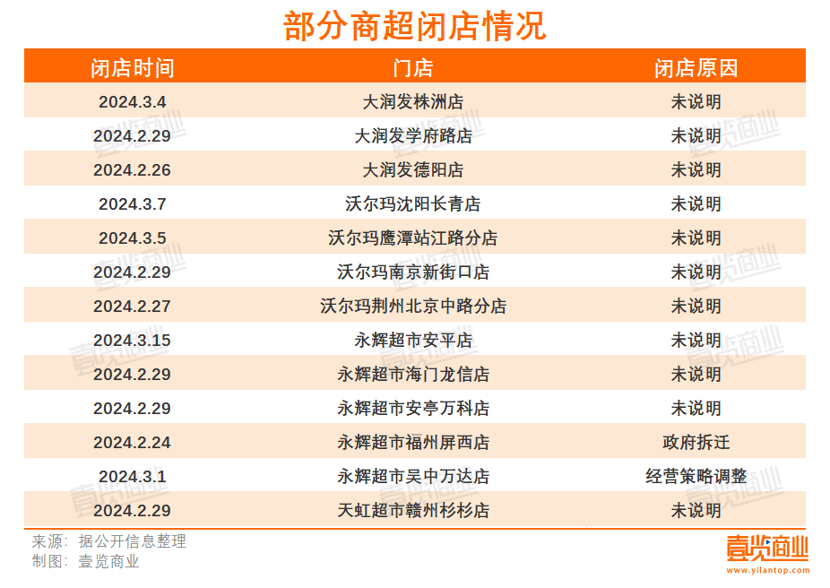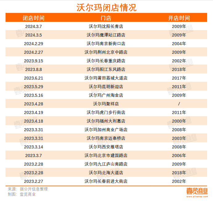2月29日,沈陽(yáng)沃爾瑪長(zhǎng)青店突發(fā)公告稱,將于3月7日停止?fàn)I業(yè)。事實(shí)上,沃爾瑪并非只關(guān)閉了一家門店:沃爾瑪荊州北京中路店2月27日停業(yè);沃爾瑪南京首店于2月29日起停止?fàn)I業(yè);江西鷹潭沃爾瑪超市3月5日起停止?fàn)I業(yè)。壹覽商業(yè)獨(dú)家統(tǒng)計(jì)了自2023年以來(lái)的沃爾瑪閉店情況,發(fā)現(xiàn)一年時(shí)間內(nèi),沃爾瑪至少關(guān)閉了19家門店,其中15家為10年以上的老店。