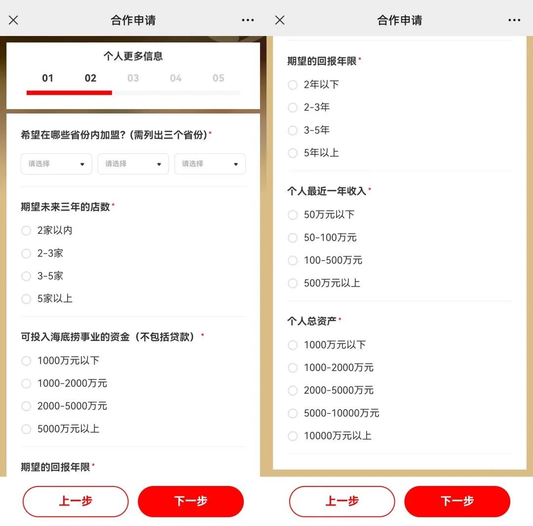 不過,海底撈并未透露將具體以何種形式開放加盟以及資金要求,僅在加盟合作申請(qǐng)表中有較為粗略的信息征集。