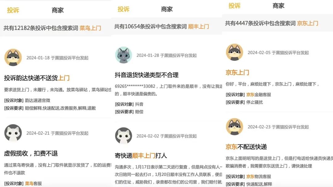 在黑貓投訴中搜索菜鳥上門,有12182條投訴;搜索順豐上門,有10654條投訴;搜索京東上門,有4447條投訴。