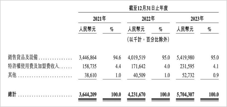 2021-2023年,茶百道貨品及設(shè)備銷(xiāo)售實(shí)現(xiàn)營(yíng)收34.47億、40.20億、54.2億,占比分別94.6%、95%、95%;特許權(quán)使用費(fèi)及加盟費(fèi)收入分別為1.59億、1.72億、2.32億,占比分別為4.4%、4.0%、4.1%。
