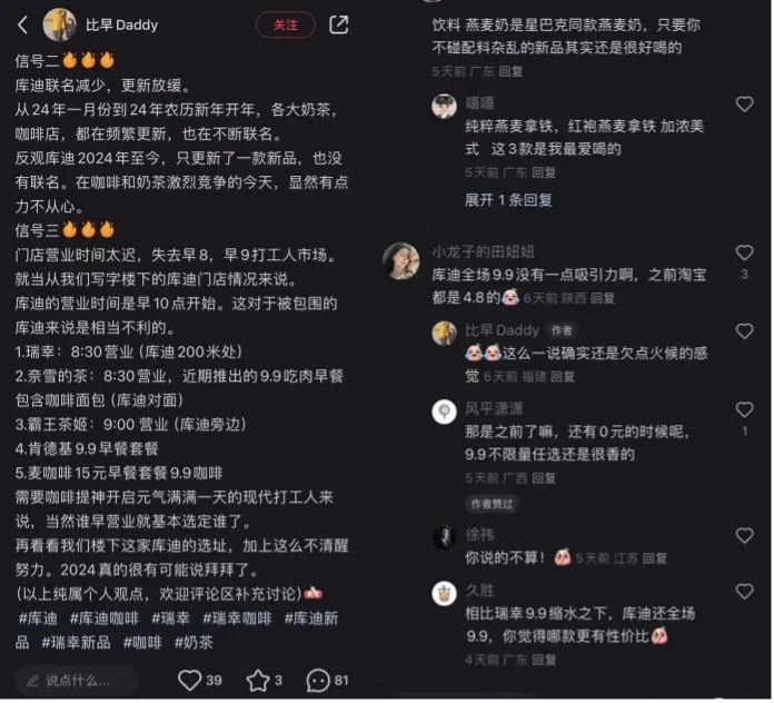 他同時表示,自己工作的寫字樓附近的庫迪營業(yè)時間為早10點(diǎn),比周圍的瑞幸、奈雪、肯德基等門店都要晚,對搶占早8、早9打工人市場極其不利。