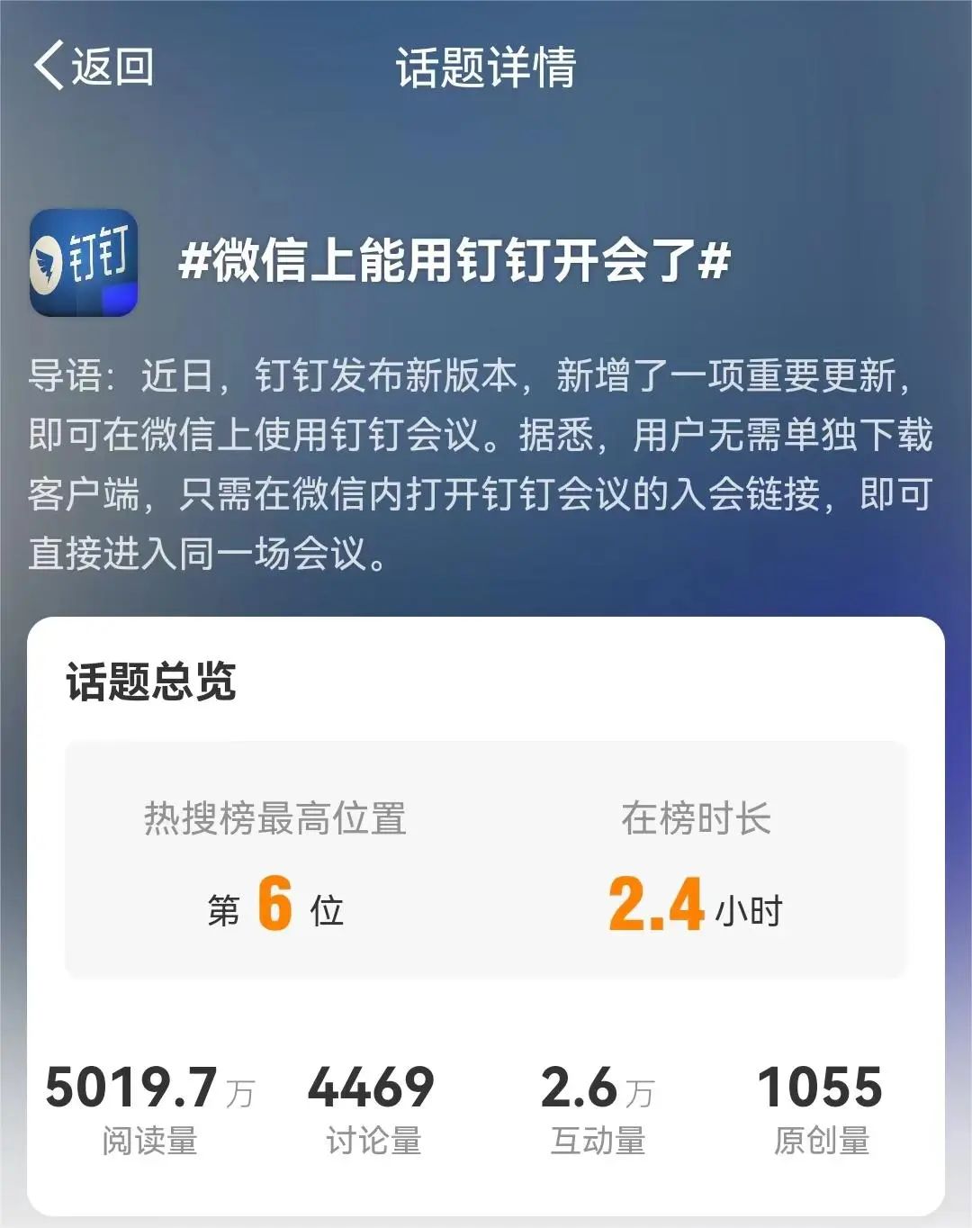 釘釘與微信互相開放的消息也引發(fā)了網(wǎng)友的熱議。隨之,“微信上能用釘釘開會了”的話題也沖上熱搜,截至目前收獲了5019.7萬的閱讀量。
