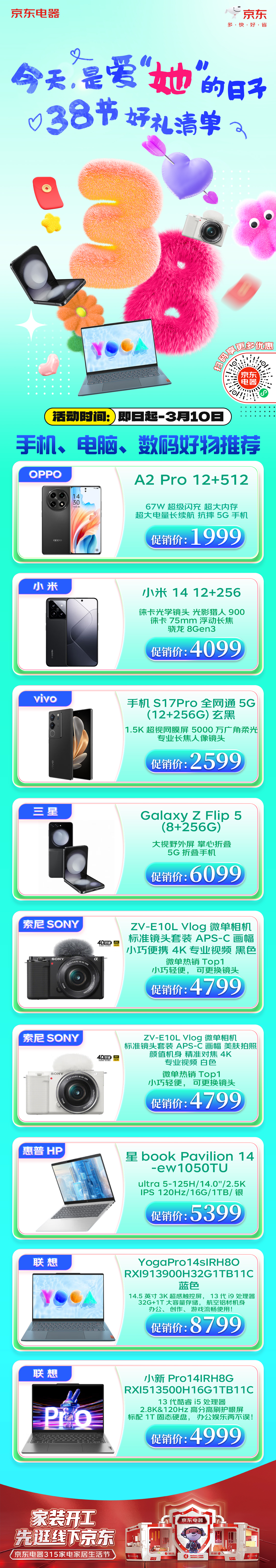 活動期間,京東五星電器聯(lián)合華為、OPPO、vivo、小米、三星等品牌,為廣大女性同胞“獻(xiàn)禮”,像67W超級閃充,超大內(nèi)存的OPPO A2 Pro 12+512,女神價1999元;徠卡光學(xué)鏡頭的小米14 12+256,促銷價4099元;大視野外屏的折疊手機三星Galaxy Z Flip 5,活動價6099元;索尼ZV_E10L Vlog微單相機(黑色、白色),可更換鏡頭,活動價4799元;惠普星book Pavilion 14-ew1050TU,問候價5399元等等熱門數(shù)碼機型,釋放女神優(yōu)惠價,迎得不少有送禮需求的消費者青睞。