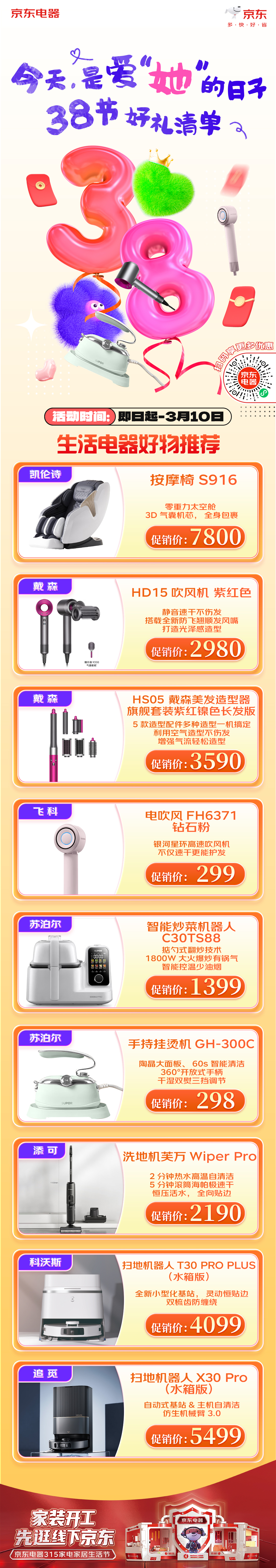 京東電器、京東五星電器線下門店在活動期間,將備受女性消費者青睞的智能按摩椅、掃地機器人、手持掛燙機,以及電吹風(fēng)、美發(fā)造型器等個護(hù)產(chǎn)品全面放價,包括蘇泊爾智能炒菜機C30TS88,具備掂勺式翻炒技術(shù)、智能控溫少油煙,活動價1399元;飛科電吹風(fēng)FH6371鉆石粉,不僅速干更能護(hù)法,女神價299元;戴森HS05美發(fā)造型器旗艦套裝,促銷價3590元;60s智能清潔、干濕雙熨三檔調(diào)節(jié)的蘇泊爾手持掛燙機GH-300C,女神節(jié)298元;添可洗地機芙萬Wiper Pro,2分鐘熱水高溫自清潔,活動價2190元等等爆款生活電器產(chǎn)品,為廣大女性提供節(jié)日福利。