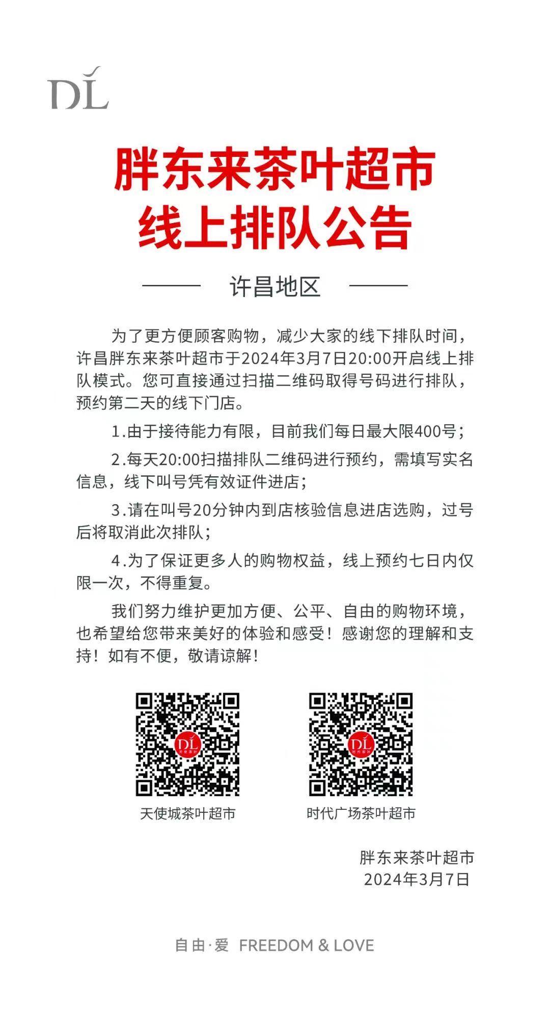 公告信息顯示,為了更方便顧客購物,減少顧客的線下排隊時間,許昌胖東來茶葉超市將于2024年3月7日20:00開啟線上排隊模式。消費(fèi)者可通過掃描二維碼取得號碼進(jìn)行排隊,預(yù)約第二天的線下門店。