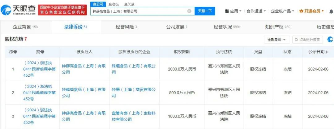2月6日,鐘薛高食品(上海)有限公司新增3則股權(quán)凍結(jié)信息,凍結(jié)股權(quán)數(shù)額分別為2000萬元、1000萬元、500萬元,股權(quán)被執(zhí)行的企業(yè)分別為殊趣食品(上海)有限公司、盤箸有喜(上海)生物科技有限公司、鐘嘉(上海)商貿(mào)有限公司,凍結(jié)期限自2024年2月6日至2027年2月5日。