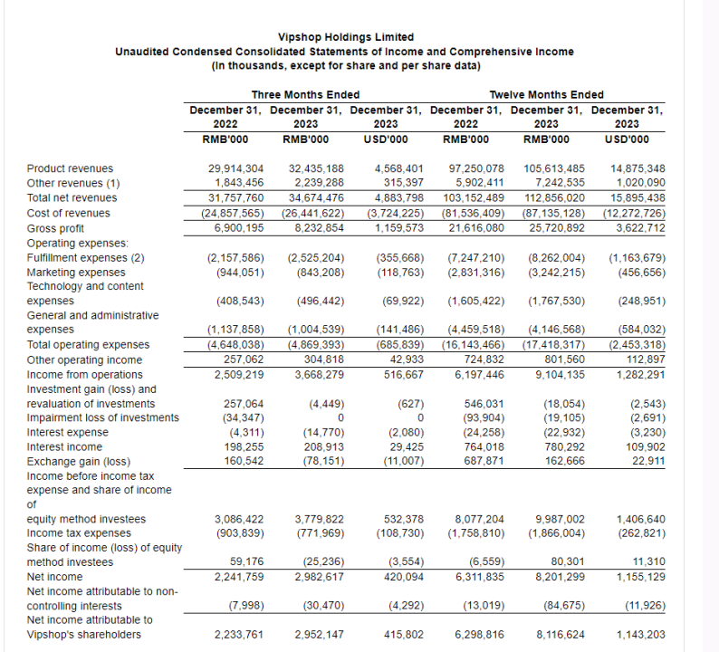 這家公司的最新財(cái)報(bào)顯示,2023年實(shí)現(xiàn)凈營(yíng)收1129億元,同比增長(zhǎng)9.4%;歸屬于股東的凈利潤(rùn)為81億元,同比增長(zhǎng)28.9%;Non-GAAP凈利潤(rùn)95億元,同比增長(zhǎng)39.1%。同時(shí),GMV首次突破2000億元,同比增長(zhǎng)18.7%,相較于2023年全國(guó)實(shí)物商品網(wǎng)上零售額同比增長(zhǎng)8.4%,唯品會(huì)在去年跑贏了電商大盤(pán)。