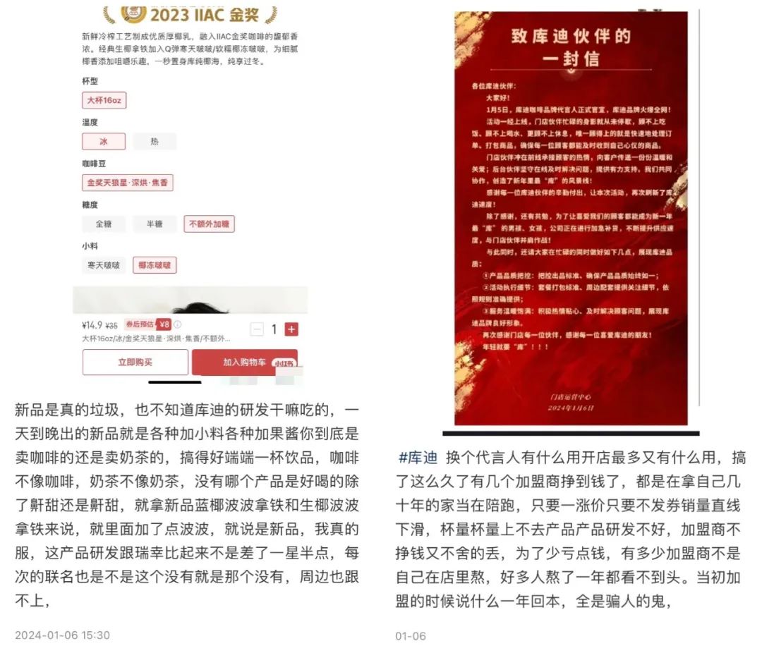 反觀庫迪咖啡,自創(chuàng)立以來并未成功推出所謂的“爆款”產(chǎn)品。有疑似聯(lián)營商曾吐槽庫迪“一天到晚出的新品就是各種加小料各種加果醬”,“搞得好端端一杯飲品,咖啡不像咖啡,奶茶不像奶茶”。