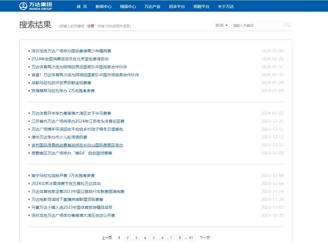 事實上,曾榮登過中國首富寶座的王健林,有一顆非常大的“野心”?康禺a(chǎn)發(fā)家的他,有過文旅夢,有過電影夢,自然也少不了體育夢。雷達財經(jīng)在萬達集團官網(wǎng)搜索關(guān)鍵詞“體育”,可以搜尋到足足61頁的關(guān)聯(lián)結(jié)果。