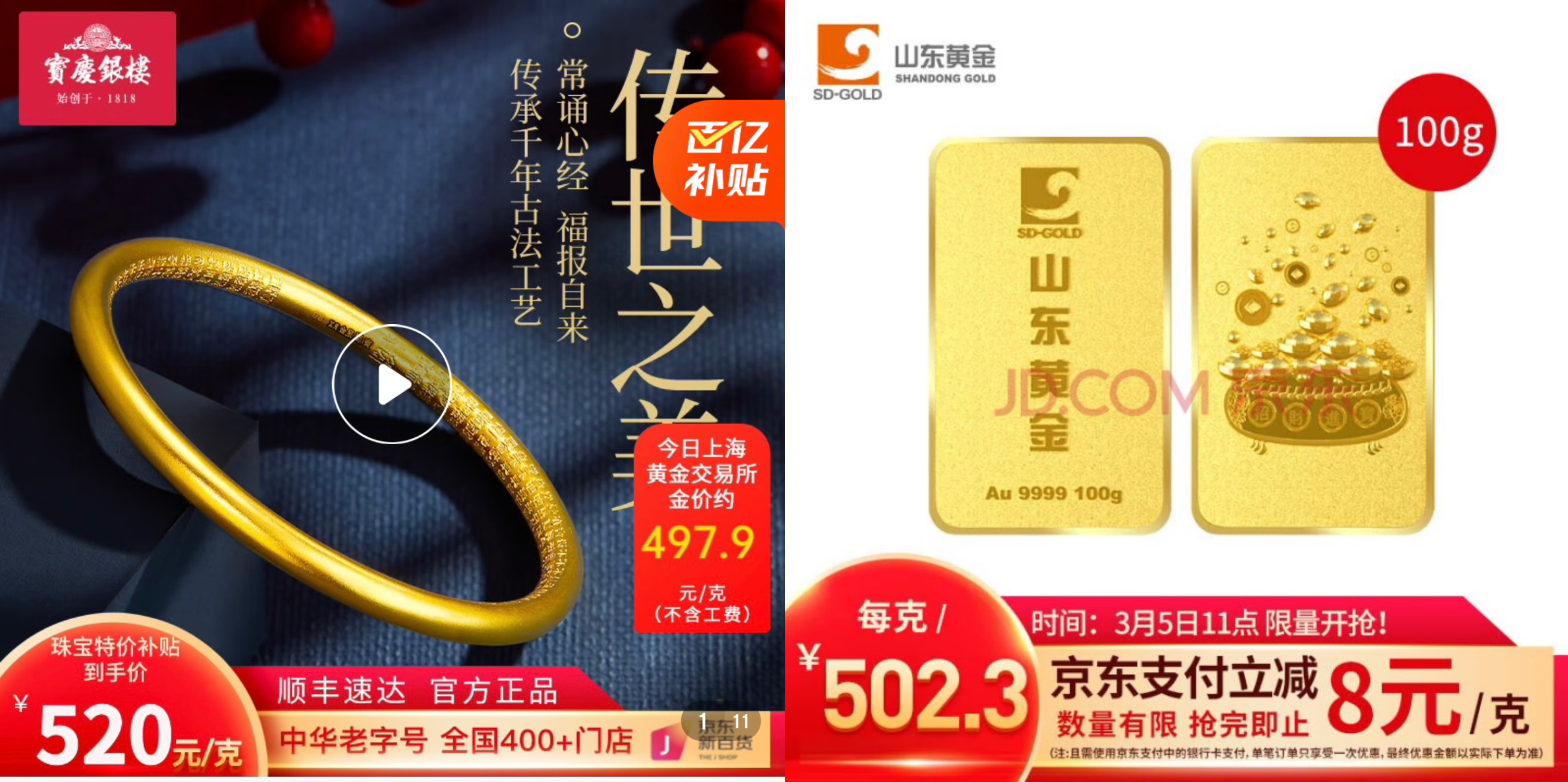 例如熱銷的寶慶銀樓古法足金手鐲28.7g,日常價(jià)18729元,3月6日百億補(bǔ)貼后到手價(jià)僅需14924元,單克重價(jià)520元,真金白銀地補(bǔ)貼了近4000元。除了金飾外,更具投資、保值性且工費(fèi)、克重價(jià)更低的的投資金條也在京東熱賣,如山東黃金的投資金條,在3月5日補(bǔ)貼后每克僅502元,接近金價(jià)大盤價(jià),是投資收藏的優(yōu)選。