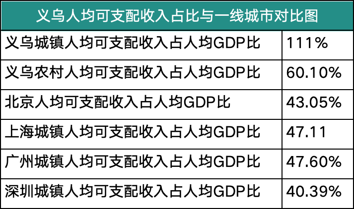 再來看下義烏市與一線城市人均可支配收入占人均GDP比: