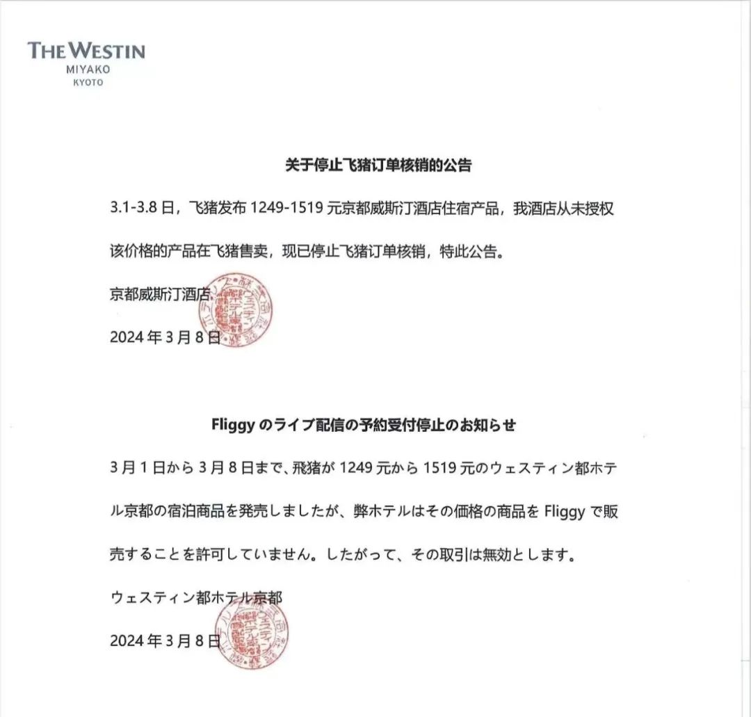 不過值得一提的是,就在飛豬推出“攻城價(jià)”之后,京都威斯汀酒店發(fā)布聲明稱,其從未授權(quán)該價(jià)格的產(chǎn)品在飛豬售賣,現(xiàn)已停止飛豬訂單核銷。