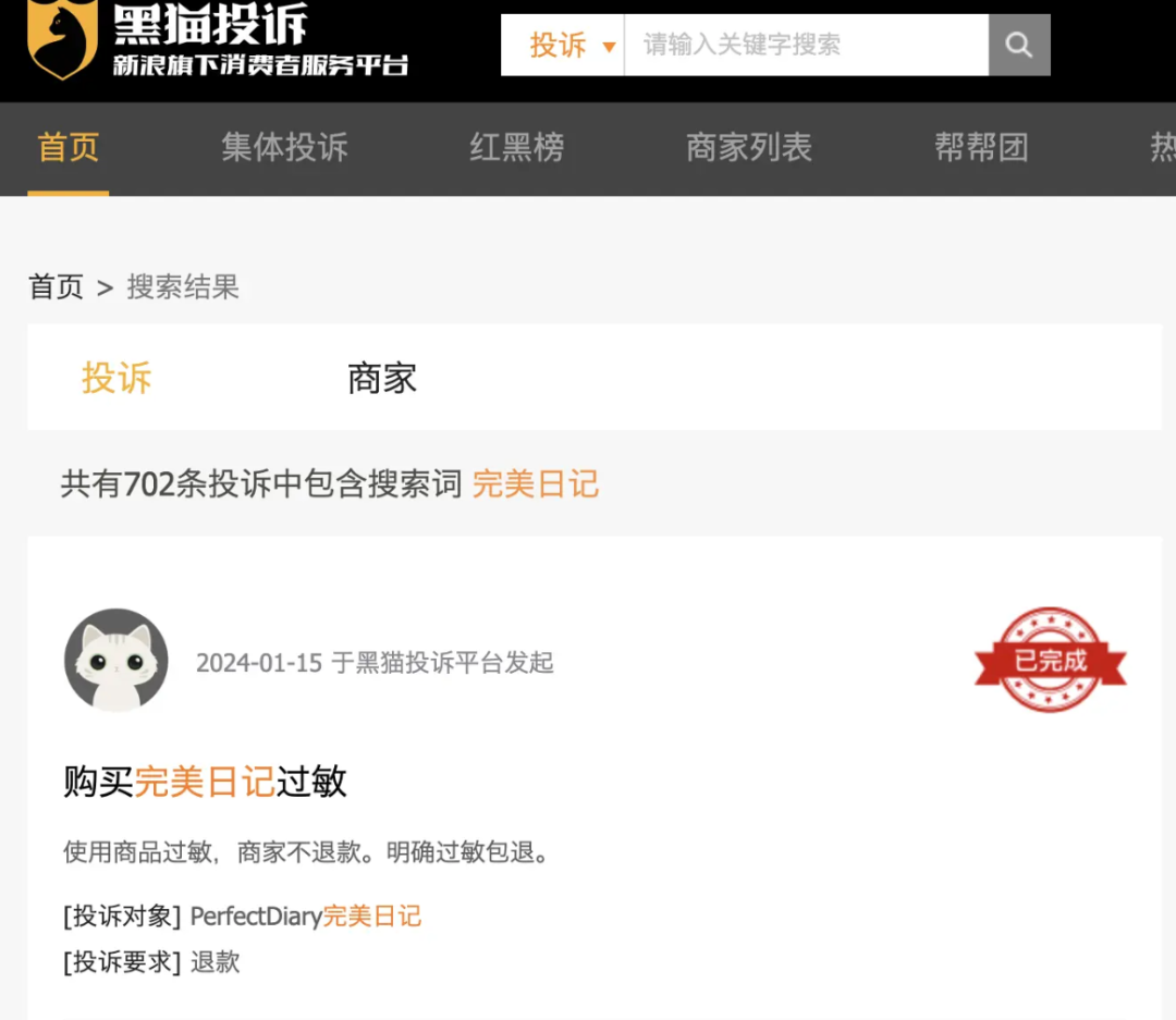 消費(fèi)品=安全,是大部分消費(fèi)者內(nèi)心中的認(rèn)知。不過,事實(shí)并非如此,特別是在美妝產(chǎn)品這樣的特定賽道。在黑貓投訴中,一位消費(fèi)者購買了完美日記的日拋美瞳,然而僅僅佩戴2小時(shí)后,出現(xiàn)眼睛發(fā)炎的情況,該投訴正在處理當(dāng)中。不過,投訴似乎反饋了完美日記缺乏產(chǎn)品力。