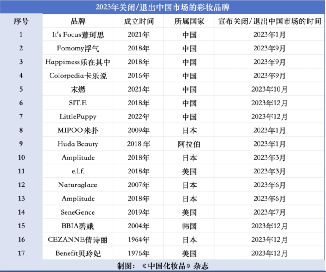2022年雙十一,完美日記罕見的缺席了李佳琦的預(yù)售直播間活動(dòng),也沒有像往常一樣高調(diào)的宣布戰(zhàn)績,這背后是跌落美妝榜單前十的無奈。2023年618和雙11預(yù)售榜單中,完美日記仍未現(xiàn)身。特別是,2023年17家美妝品牌關(guān)閉/退出,完美日記并未抓住這一機(jī)遇。