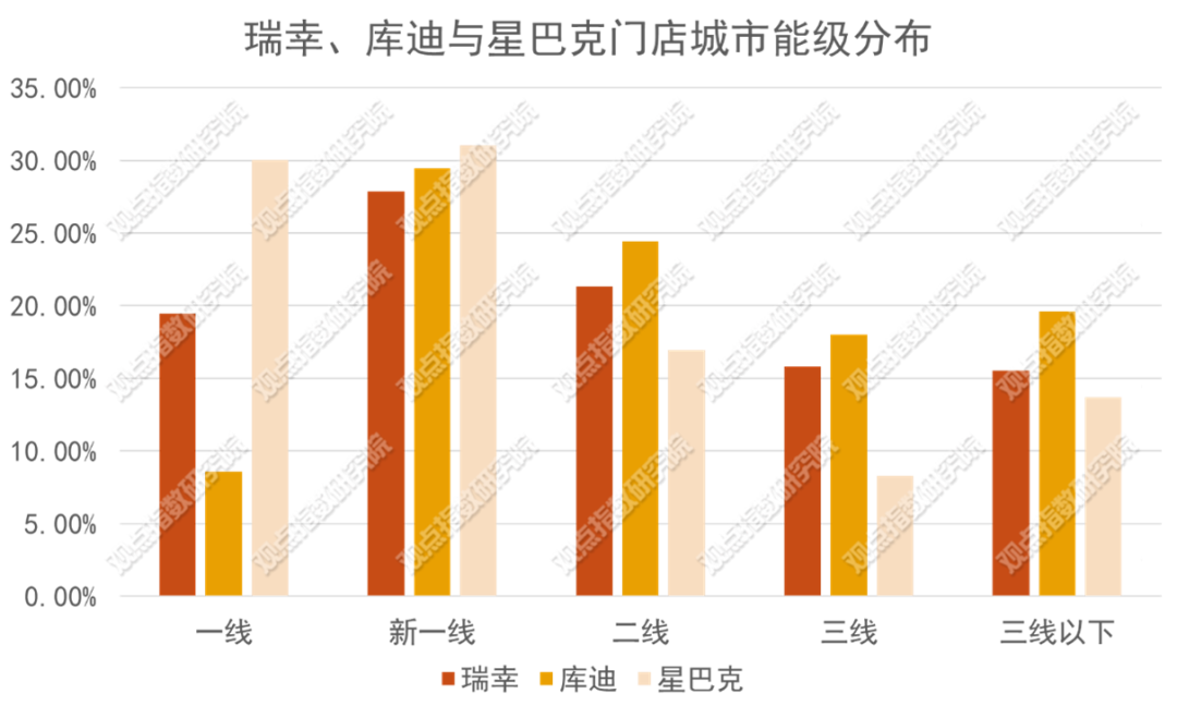模式差異下,上述品牌的城市分布也呈現(xiàn)不同特點,如星巴克在一線及新一線城市的占比明顯高于瑞幸和庫迪。