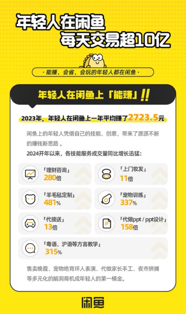 數(shù)據(jù)顯示,過去一年,閑魚95后用戶人均賺了2700元,不少年輕人在閑魚上第一次體驗了“當(dāng)老板 做生意”。理財咨詢、羊毛氈定制、夜市拼攤、代做家長手工、貓咪絕育壞人表演、上門妝發(fā)、監(jiān)督服務(wù)、旅行規(guī)劃等成為年輕人新“致富密碼”。