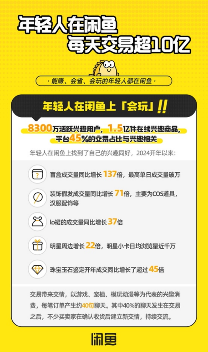 最新數(shù)據(jù)顯示,閑魚目前已有8300萬活躍興趣用戶,1.5億件在線興趣商品,覆蓋潮玩、文玩、運(yùn)動戶外、寵植、數(shù)碼、穿搭等大大小小數(shù)百個品類,平臺上近半數(shù)交易都與興趣相關(guān)。
