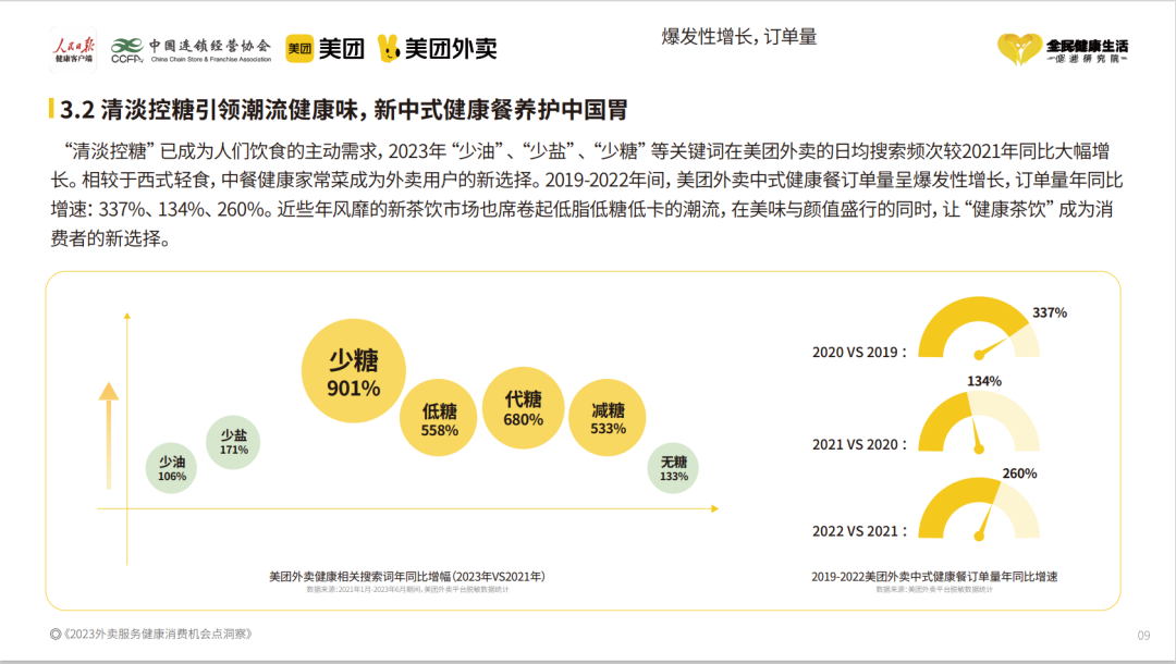 中國(guó)連鎖經(jīng)營(yíng)協(xié)會(huì)和美團(tuán)外賣(mài)發(fā)布的《2023外賣(mài)服務(wù)健康消費(fèi)機(jī)會(huì)點(diǎn)洞察》顯示,相較于西式輕食,中餐健康家常菜成為外賣(mài)用戶(hù)的新選擇,在2019-2022年間,美團(tuán)外賣(mài)中式健康餐訂單量呈現(xiàn)爆發(fā)性增長(zhǎng),訂單量年同比增速337%、134%、260%。