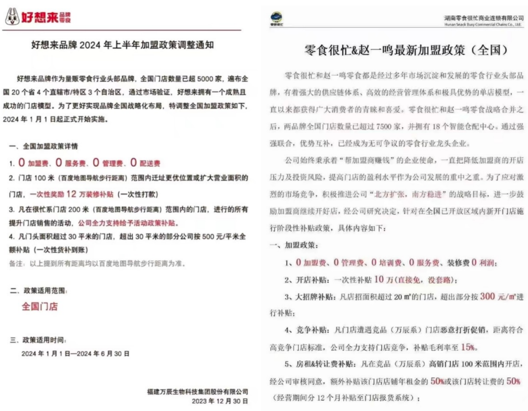 零食很忙最新加盟政策中明確提出,“凡門店遭遇競品(萬辰系)門店惡意打折促銷,距離符合高競爭門店標(biāo)準(zhǔn),公司全力支持門店競爭,補(bǔ)貼毛利率至15%”。