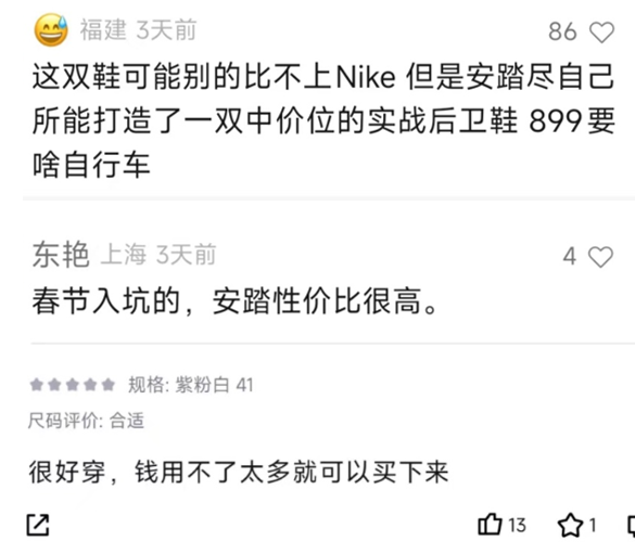從相關(guān)評論來看,消費(fèi)者普遍認(rèn)為,安踏歐文一代性價比較高。一位消費(fèi)者表示:“安踏已盡其所能打造了一款中價位的實(shí)戰(zhàn)籃球鞋,這價位還要啥自行車?”相比于其他運(yùn)動“大牌”,如耐克、阿迪達(dá)斯動輒近千元的鞋類產(chǎn)品價格,與球星聯(lián)合設(shè)計的安踏歐文一代,價格較為接近大眾消費(fèi)水平。