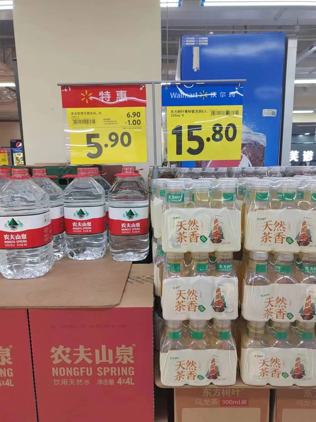 在沃爾瑪、永旺等超市,一箱箱農(nóng)夫山泉瓶裝水、桶裝水、茶飲料等被擺放在顯眼位置,按促銷(xiāo)價(jià)算,一瓶380ml的農(nóng)夫山泉不足一元,與電商平臺(tái)價(jià)格已經(jīng)相仿。有超市員工表示,農(nóng)夫山泉產(chǎn)品都在正常售賣(mài),銷(xiāo)量未出現(xiàn)明顯下滑。