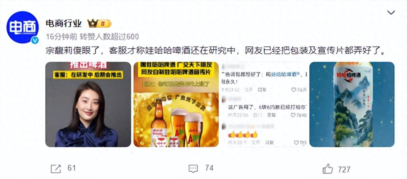 還沒(méi)等到娃哈哈回應(yīng),已經(jīng)有不少網(wǎng)友贊同這個(gè)提議,甚至連產(chǎn)品外觀、廣告語(yǔ)都想好了。印有娃哈哈logo的特級(jí)啤酒,或者是印有宗老頭像的瓶子,甚至還有網(wǎng)友提議將娃哈哈與中國(guó)風(fēng)結(jié)合,印上中國(guó)山水畫、生肖、瑞獸等的啤酒,再加上“喝娃哈哈啤酒,廣交天下朋友”的廣告語(yǔ),一定能讓娃哈哈啤酒走向國(guó)際。