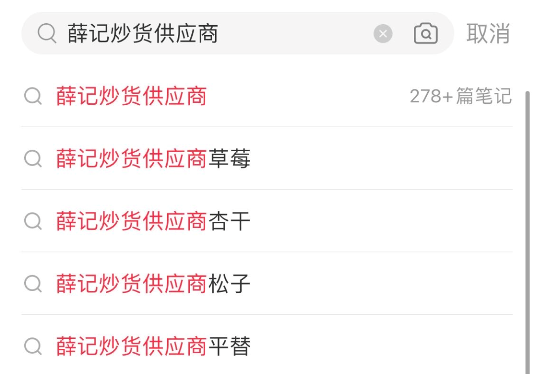 為了以更低的價格吃到相同的美味,消費者自發(fā)搜羅薛記炒貨的供應商,連“薛記炒貨供應商”的關(guān)鍵詞下都出現(xiàn)了近300條筆記。