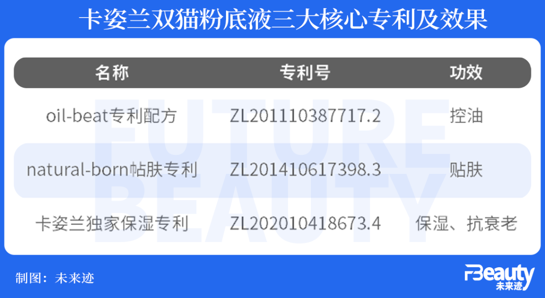 在深厚研發(fā)實力的基礎上,卡姿蘭其實針對不同人群需求布局了對應的、有市場競爭壁壘的不同產品,其中第一個大單品“雙貓粉底液”,就首先瞄準大眾市場中等偏上的點位,并通過三項專利,將產品的“功能價值”屬性拉滿。