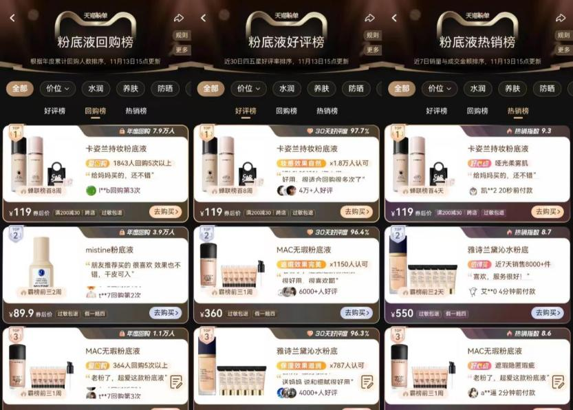 由于物理價值和情緒價值雙高,“雙貓粉底液”在天貓粉底液榜單中的好評、回購、熱銷榜均為持續(xù)占據第1的位置。