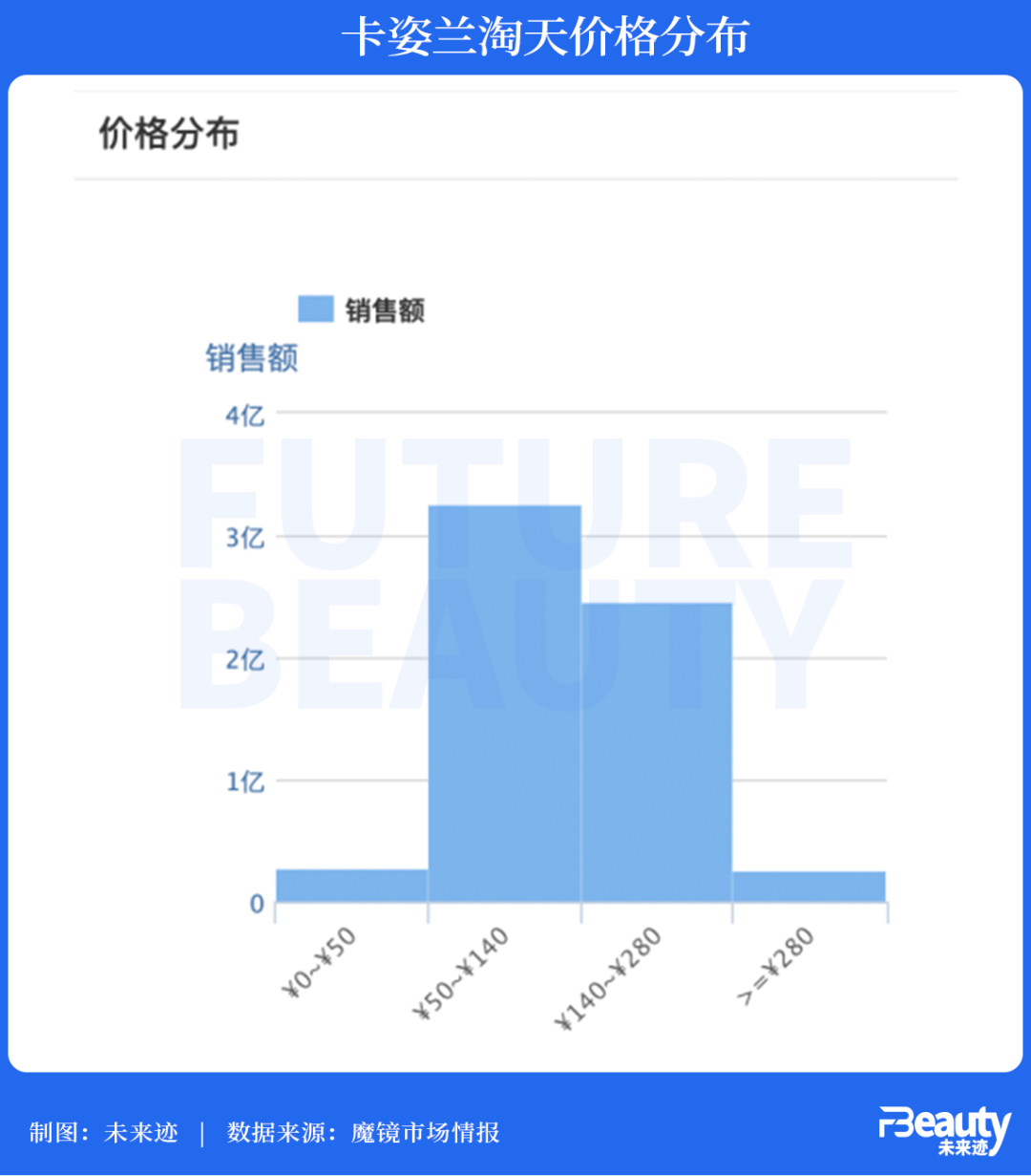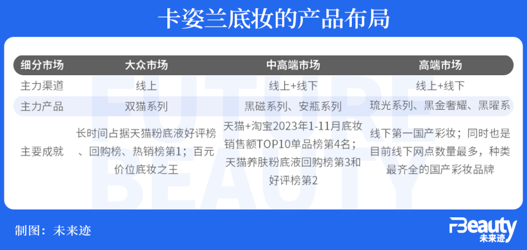 至此,卡姿蘭通過「雙貓」「黑磁」「安瓶」三大系列的產品布局,橫掃90-280元之間的全部價格帶,讓大眾市場、中高端市場的消費者都有可選擇的底妝產品。