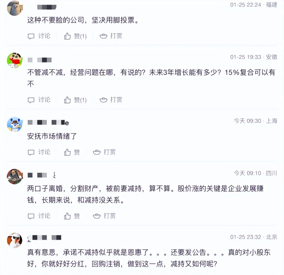 股價大跌后,即使安井食品表示控股股東福建國力民生承諾自愿延長股份鎖定期,未來5年內(nèi)其不以任何方式減持所持有的公司股份,也沒有得到投資者們的認(rèn)可,反而各評論區(qū)中戾氣沖天。