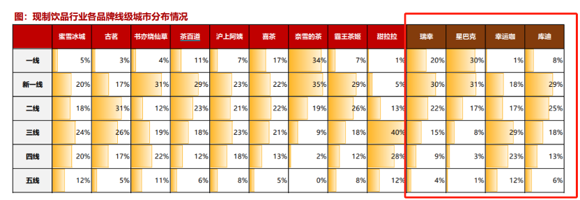 這其中,瑞幸、星巴克、庫迪等現(xiàn)磨咖啡品牌均選擇順應(yīng)行業(yè)規(guī)律,優(yōu)先布局一線、新一線城市。少數(shù)品牌如“幸運(yùn)咖”借力主品牌蜜雪冰城的低線城市渠道優(yōu)勢選擇自下而上的策略。