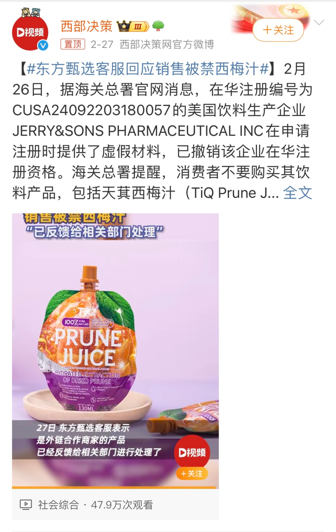 海關(guān)總署在2月提醒停止食用天萁西梅汁,由于該飲料生產(chǎn)企業(yè)JERRY&SONS PHARMACEUTICAL INC在申請(qǐng)注冊(cè)時(shí)提供了虛假材料,已撤銷該企業(yè)在華注冊(cè)資格。